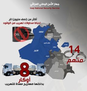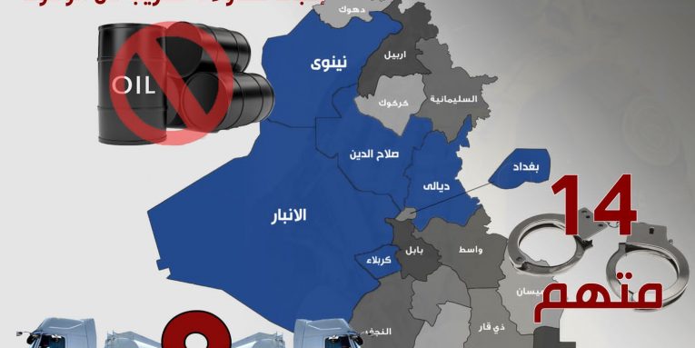 عمليات الضبط جرت في محافظات (بغداد، والأنبار، وديالى، وصلاح الدين، ونينوى، وكربلاء) وأسفرت أيضا عن مداهمة (٨) أوكار ضمت بداخلها صهاريج معدة للتهريب، فضلاً عن القبض على (١٤) متهماً وفق مذكرات قبض قضائية.
