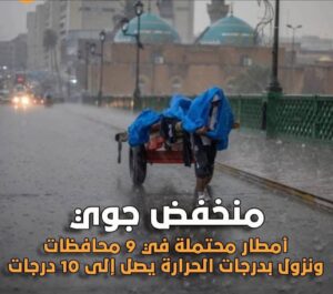 وتكون الأجواء صافية إلى غائمة جزئياٍ أو غائمة كلياً على فترات في المدن التي ستشهد نشاطاً لسحب الرعدية مع فرصة واردة لهطول زخات مطر رعدية متفرقة تشمل بغداد وديالى ووسط وشرق الأنبار والبصرة والسليمانية وبعض مناطق من كركوك وأربيل ودهوك وأجزاء من صلاح الدين.
