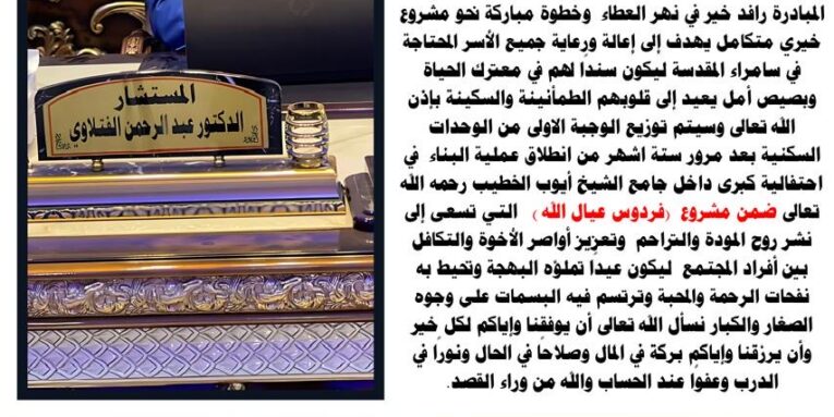 مشروع فردوس عيال لله 2 مايو، 2025 247 الدكتور عبد الرحمن الفتلاوي مستثمرومالك مشروع درة سامراء السكني مشروع (فردوس عيال لله )بإنشاء خمسة آلاف وحدة سكنية توزع مجانا الزامل والأيتام والمتعففين والذين لايملكون مصدر رزق ليكون لهم سكن مجاني .