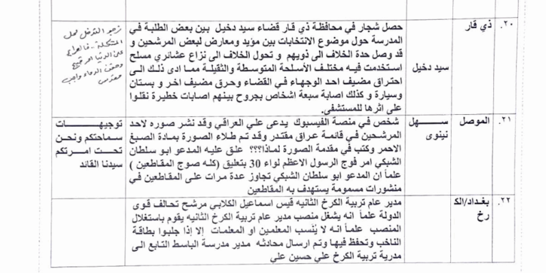 واظهرت وثيقة نشرتها منصات مقربة من التيار الوطني الشيعي والتي تتضمن موقفا حول ما يحصل بسبب الانتخابات في عموم العراق والتي تقدم بشكل دوري الى السيد الصدر على ما يبدو، ان شجارا في محافظة ذي قار وقع بين بعض الطلبة بسبب خلاف على دعم مرشحين للانتخابات وقد وصل الخلاف الى نزاع عشائري مسلح بين عوائلهم بالأسلحة الثقيلة والخفيفة ما أدى لاحتراق مضيفين واصابة 7 اشخاص”.