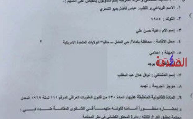 وبحسب وثيقة الأمر الصادرة عن المحكمة، فإن المتهم المُدعى “عباس فاضل بديو الشمري” المدعو بـ “علي فاضل”والمقيم حالياً في الولايات المتحدة الأمريكية، مطلوب لإحضاره مكبلاً بالقيود أمام المحكمة.