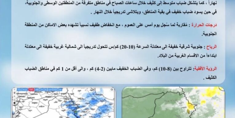 -فرص واردة لهطول زخات مطر رعدية خفيفة الشدة، تتركز في مناطق شرق وشمال شرق البلاد، على أن تنتهي هذه الفرص خلال ساعات المساء او الليل.