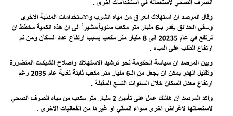 وبين المرصد ان سياسة الحكومة نحو ترشيد الاستهلاك واصلاح الشبكات المتضررة وتقليل الهدر يمكن ان يجعل من الـ6 مليار متر مكعب ثابتة لغاية عام 2035 رغم ارتفاع معدل السكان خلال السنوات التسع المقبلة.